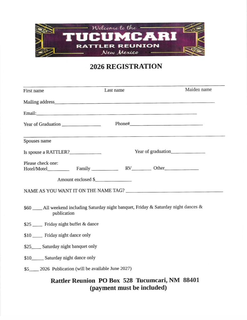 Rattler Reunion 2026 July 30-31, Aug 1 & 2, 2026 https://tucumcari-alumni-association.square.site/product/rattler-reunion-2025/21?cp=true&sa=false&sbp=false&q=false&category_id=2TNYXCGUWCH3MGTJIXQQSDTX Rattler Reunion registration 2025Download 35.170883 -103.743842